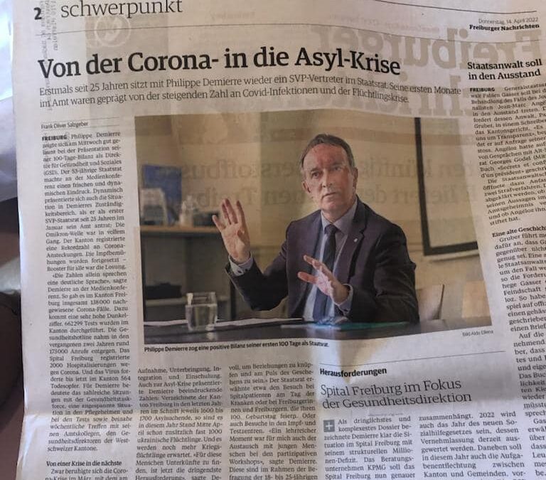 Für den neuen Staatsrat war dieser Jahresbeginn auch geprägt von der Rückkehr zur Präsenzarbeit, von Begegnungen und von der Wiederaufnahme von Veranstaltungen. Die Treffen mit der Freiburger Bevölkerung – insbesondere mit Patientinnen und Patienten des HFR am Tag der Kranken, mit hundertjährigen Freiburgerinnen und Freiburgern sowie bei Besuchen in Test- und Impfzentren – ermöglichten es, Kontakte zu knüpfen und die Stimmung vor Ort aufzunehmen.